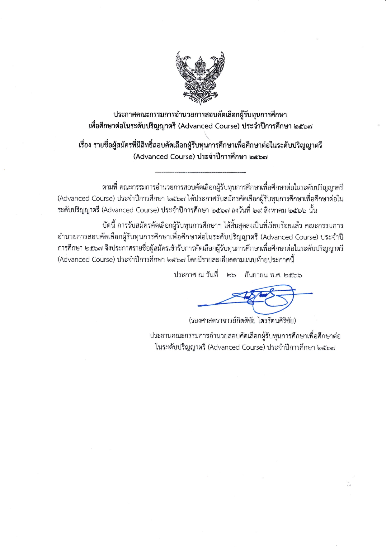 ประกาศรายชื่อผู้สมัครที่มีสิทธิ์สอบคัดเลือกรับทุนศึกษาต่อในระดับปริญญาตรี (Advanced Corse)